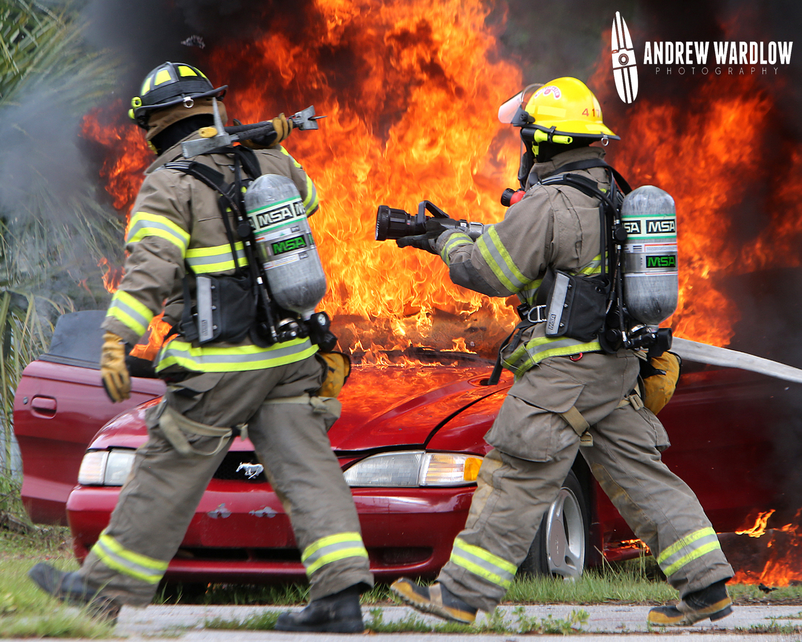 From left, Lt. David Jernigan and firefighter Jason Tate work a vehicle fire during a training exercise in Panama City. (Panama City Photographer / Andrew Wardlow)