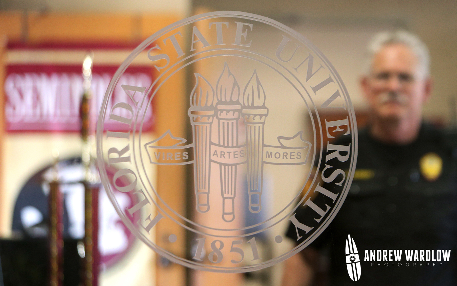 Florida State University Police Officer Duane Gorey patrols a building at the Panama City campus. (Panama City Photographer / Andrew Wardlow)
